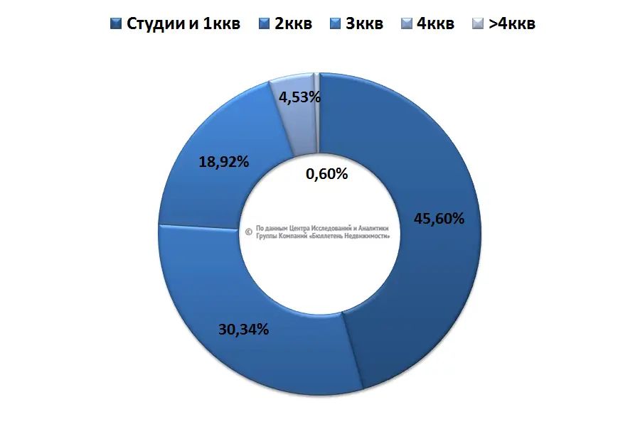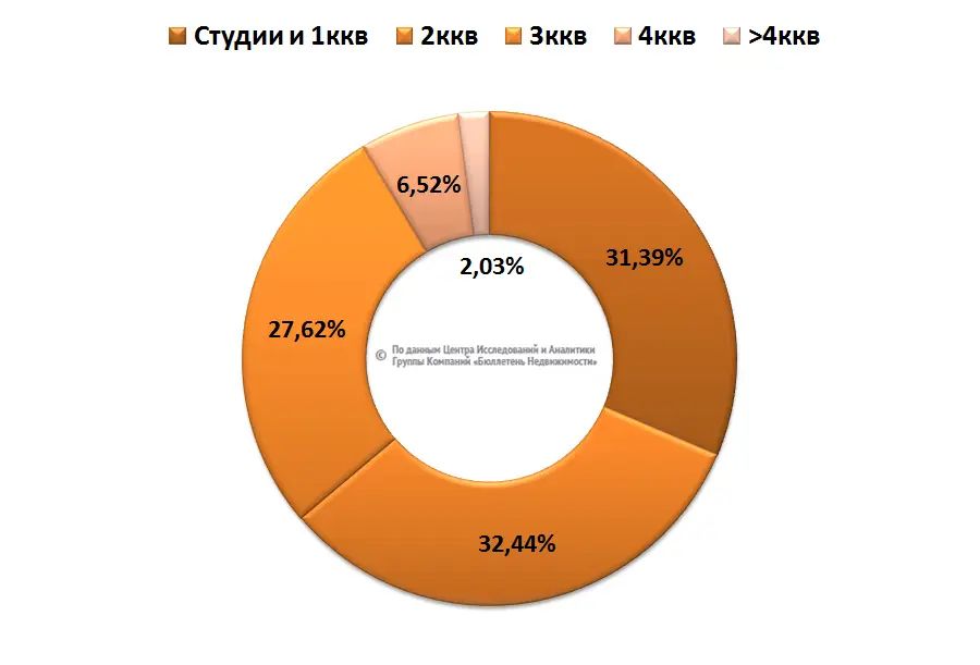 В структуре предложения на вторичном рынке квартир по-прежнему преобладают студии и одно- и двухкомнатные квартиры, они составили 63,8% рынка, трехкомнатные – 27,6%, многокомнатные – 8,6% от общего объема.