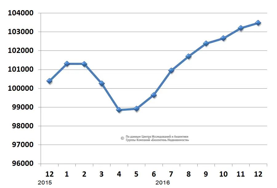 Средние цены квартир, выставленных на продажу, на конец декабря 2016 года составили: