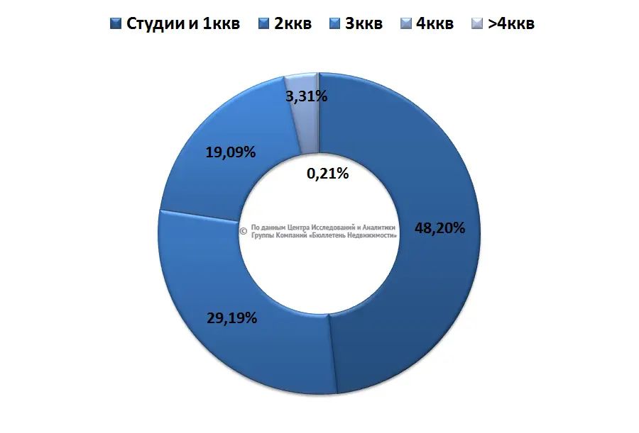 В структуре предложения по-прежнему преобладают студии и одно- и двухкомнатные квартиры, они составили 63,6% рынка, трехкомнатные – 27,8%, многокомнатные – 8,6% от общего объема.