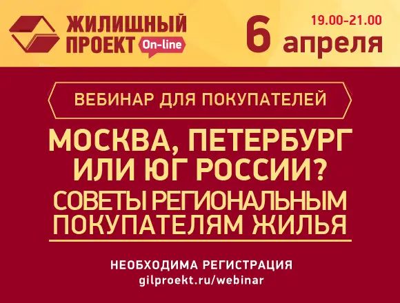 Сегодня, 6 апреля, состоится бесплатный вебинар «Москва, Петербург или юг России? Советы региональным покупателям жилья». Мероприятие будет проходить с 19.00 до 21.00 по мск.