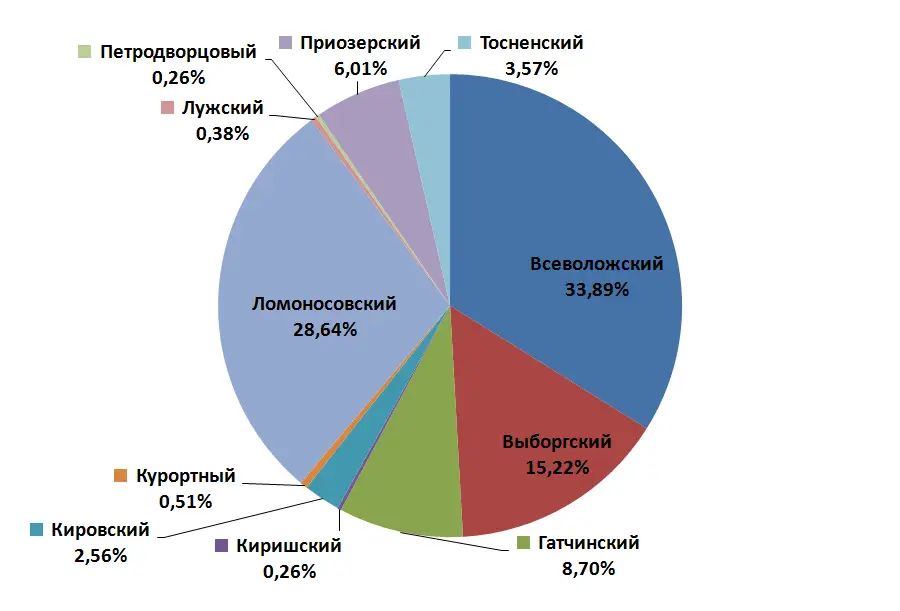 Структура продаж участков без подряда на загородном рынке Санкт-Петербурга и Ленинградской области по районам в 2016 г., % от общего количества объектов