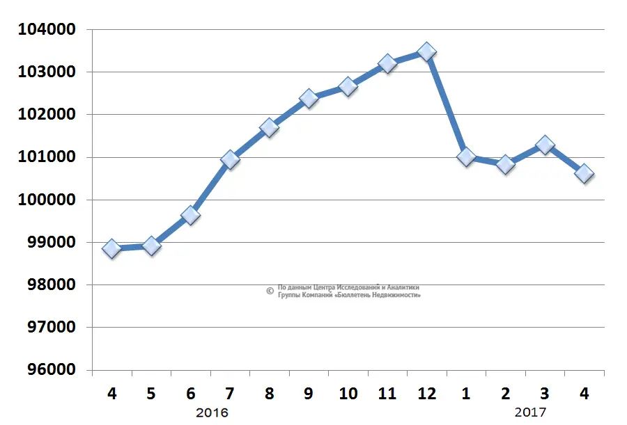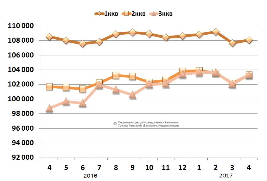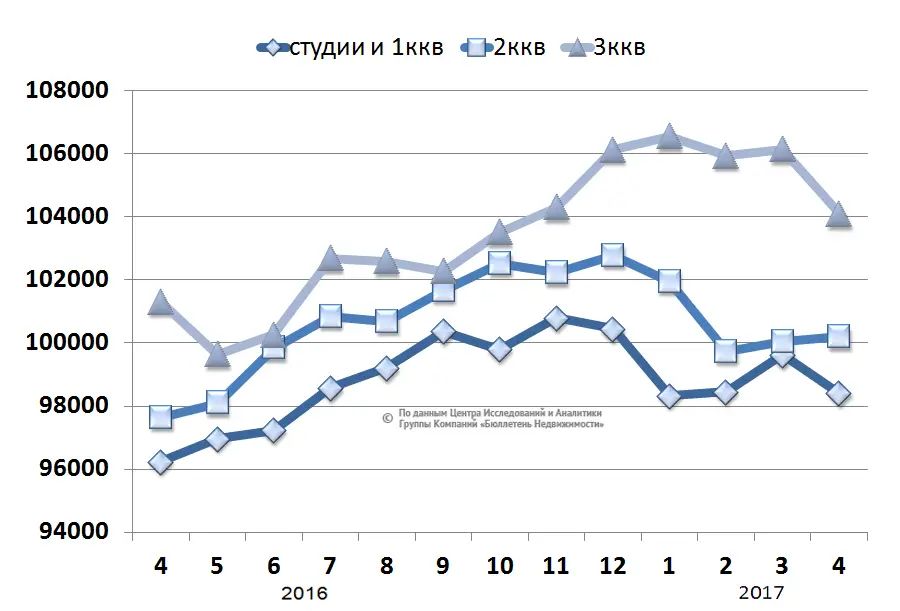Средние цены квартир, выставленных на продажу, на конец апреля 2017 года составили: