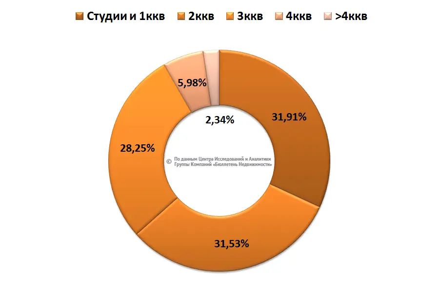 В структуре предложения на вторичном рынке квартир по-прежнему преобладают студии и одно- и двухкомнатные квартиры, они составили 63,4% рынка, трехкомнатные – 28,3%, многокомнатные – 8,3% от общего объема.