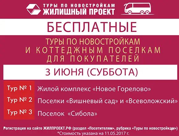 В пятницу, 02 июня, в 17.00 завершается регистрация на бесплатные автобусные туры по новостройкам и коттеджным поселкам Петербурга и Ленобласти. Мероприятия состоятся в ближайшую субботу, 3 июня.