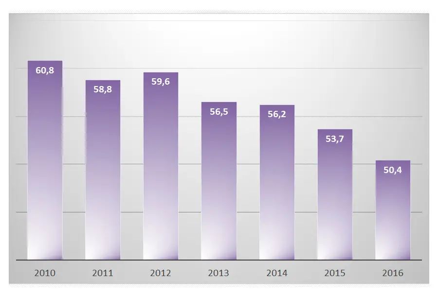 Так, с 2010 года площадь среднестатистической вводимой в эксплуатацию квартиры уменьшилась с 60,8 до 50,4 кв. м (см. диаграмму 2), а доля малогабаритного жилья (однокомнатных и студий) выросла с 48 до 62% (таблица 5).