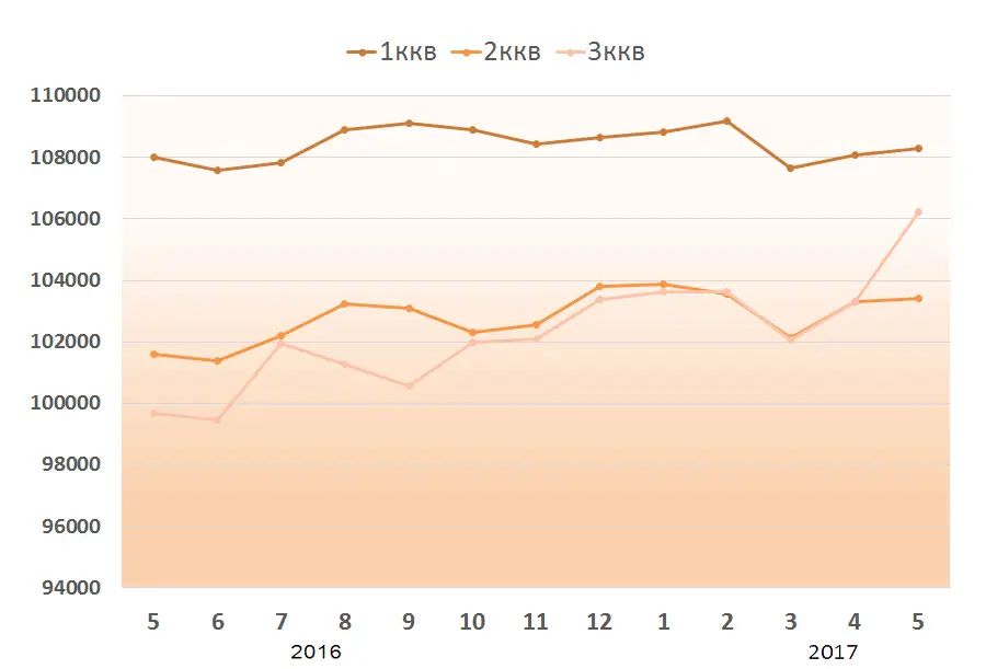За май средняя цена квадратного метра однокомнатных квартир выросла на 0,2%, двухкомнатных на 0,1%. Трехкомнатные подорожали на 2,8%.