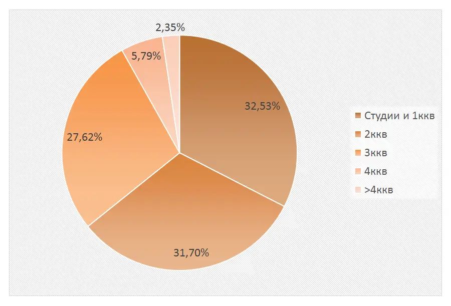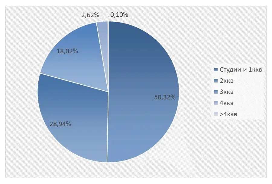 В структуре предложения на вторичном рынке квартир по-прежнему преобладают студии и одно- и двухкомнатные квартиры, они составили 64,2% рынка, трехкомнатные – 27,6%, многокомнатные – 8,1% от общего объема.