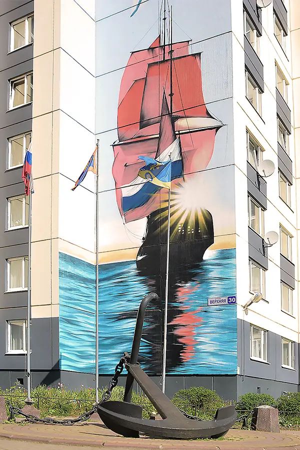 Традиционно в день ВМФ проходит церемония поднятия Андреевского флага. А жилое здание в народе получило наименование «Дом с якорями».