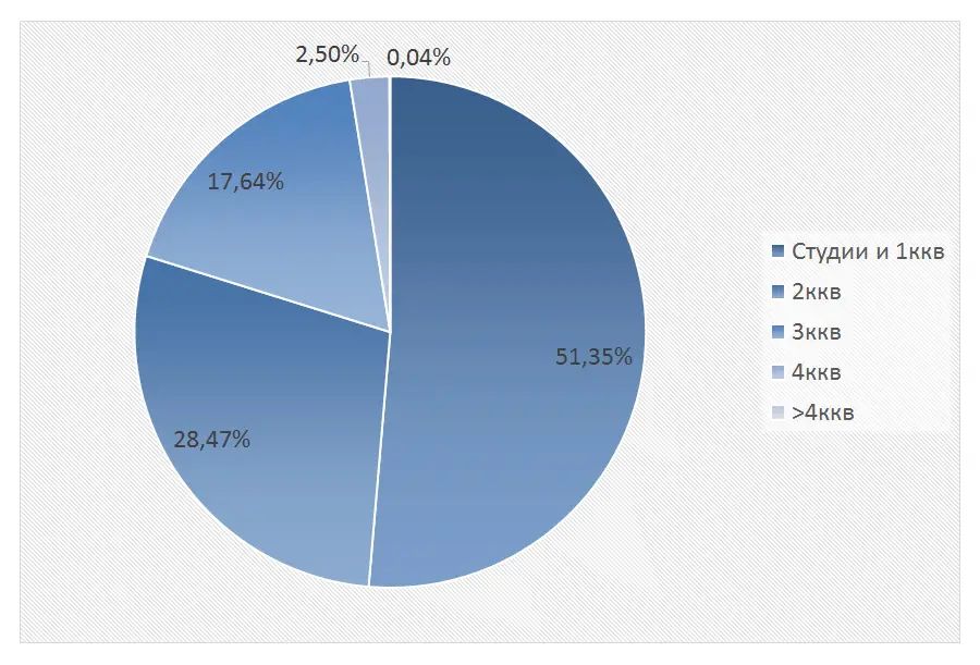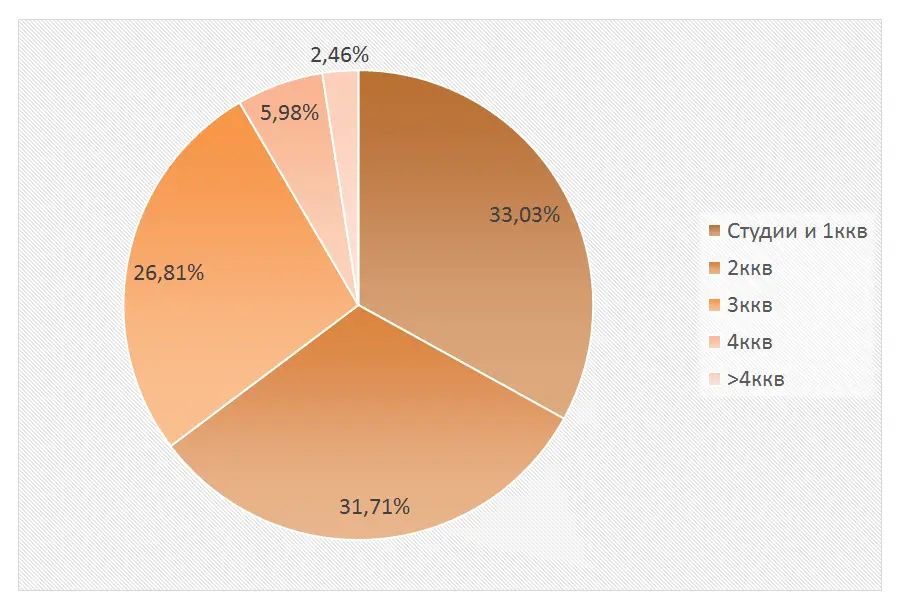В структуре предложения на вторичном рынке квартир по-прежнему преобладают студии и одно- и двухкомнатные квартиры, они составили 64,7% рынка, трехкомнатные – 26,8%, многокомнатные – 8,4% от общего объема.