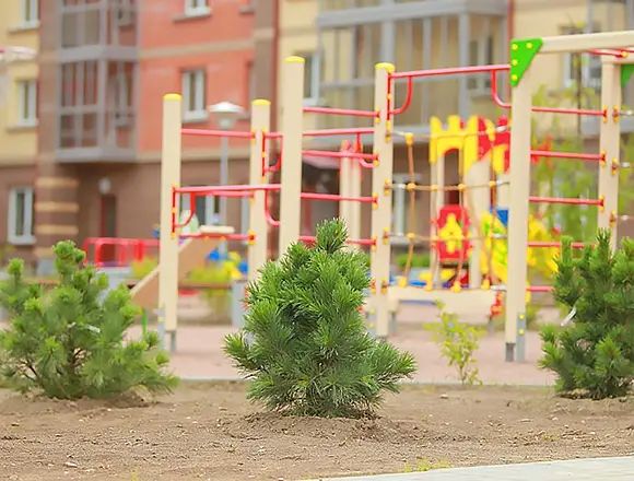 Кедровые и горные сосны, корейская пихта, голубая и колючая ели, каштан, яблони, клёны, барбарис Тунберга, кизильник Даммера, форзиция, вейгела, сирень – это только часть растений, которые украсили двор малоэтажного ЖК. «Изюминкой» проекта стала плакучая рябина, ветви которой струятся вниз и по мере разрастания образуют шатёр.
