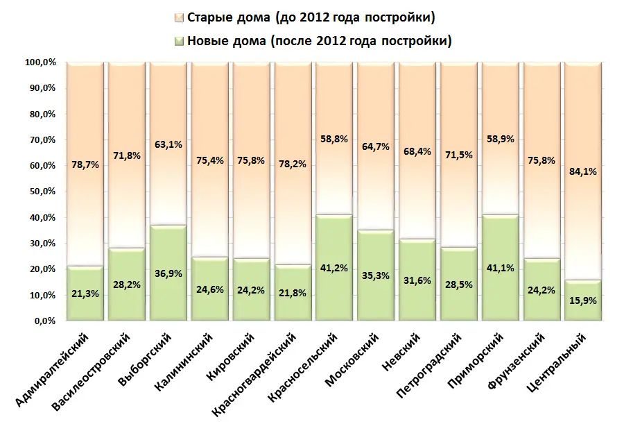 Структура предложения квартир в новых и старых домах по районам, % от общего объема