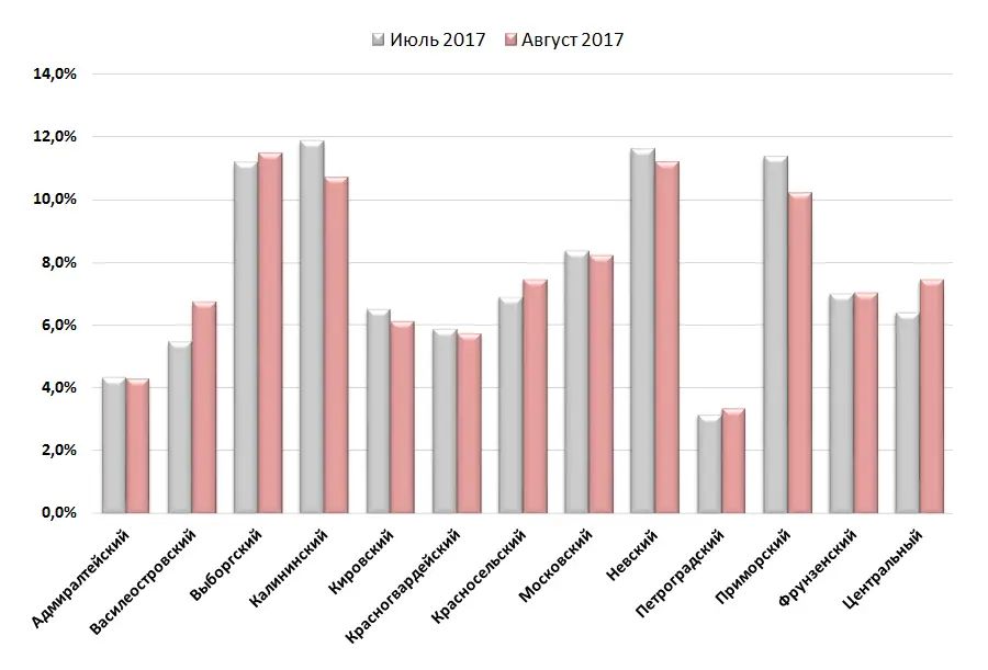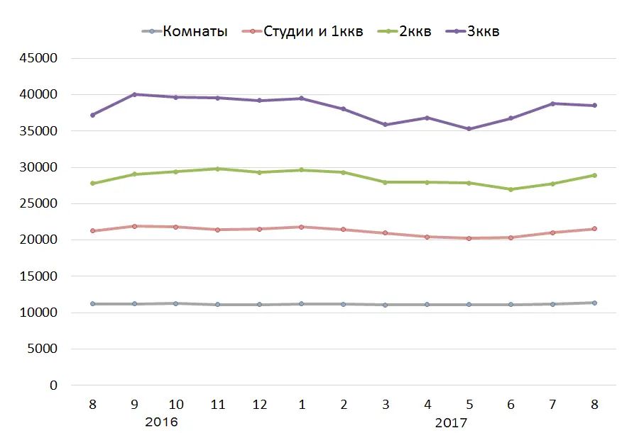 Самое дорогое жилье на рынке аренды по-прежнему предлагается в центральных районах города (Центральном, Петроградском, Василеостровском и Адмиралтейском). На конец месяца средняя цена типовой однокомнатной квартиры в них – от 25,0 до 31,7 тыс. руб. в месяц, цена двухкомнатной – от 35,2 до 47,2 тыс. руб. Трехкомнатные в центральных районах предлагаются в среднем от 48,1 до 60,4 тыс. руб. в месяц, в зависимости от месторасположения и состояния.