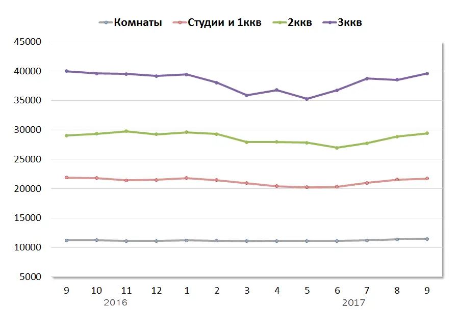 По итогам сентября 2017 года стоимость найма комнат повысилась на 0,5%, однокомнатных квартир на 0,9%. Двухкомнатные подорожали на 1,9%, трехкомнатные на 2,9%.