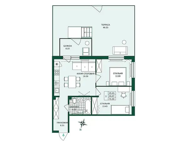 | Двушка (71,3 кв. м) в ЖК Grona Lund с террасой на первом этаже |