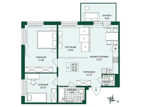 | Евродвушка в ЖК «Жемчужный берег» общей площадью 62,3 кв. м | Евротрешка в ЖК Grona Lund общей площадью 76,2 кв. м |