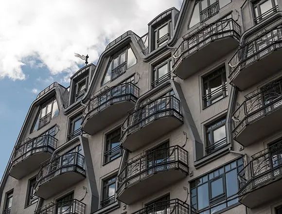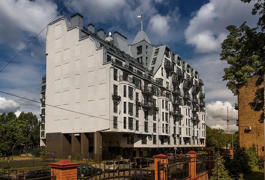 Десятиэтажный дом имеет интересную ступенчатую архитектуру с фрагментарно скатной кровлей, присущей северному модерну. Доминанта здания – впечатляющая готическая башня с флюгером. На верхних этажах располагаются просторные террасы, все квартиры – с французскими или классическими балконами, остекленными лоджиями или эркерами.