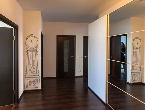 Перемещаемся внутрь здания. Опять-таки с безопасностью все в порядке – в каждом подъезде имеется служба консьержей. Рядом – колясочная, расписанная художником вручную, пока тоже почти пустая: далеко не все новоселы завершили ремонт и заселились.
