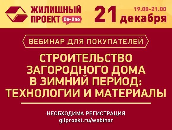 В четверг, 21 декабря, с 19.00 до 21.00 состоится бесплатный вебинар на тему «Строительство загородного дома в зимний период: технологии и материалы». Для участия в мероприятии необходима предварительная регистрация.