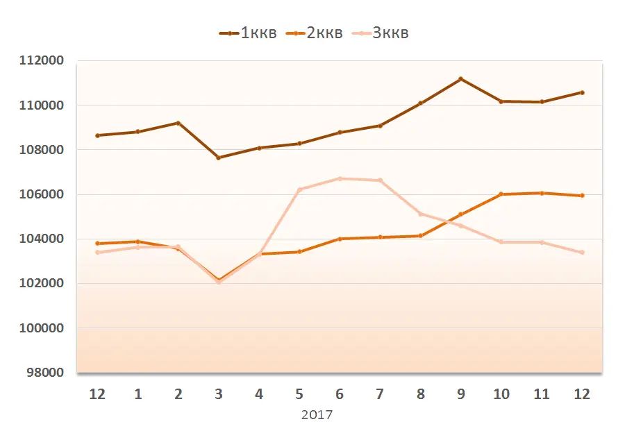 По итогам года средние цены предложения на студии и однокомнатные кваритиры повысились на 1,8%. Двухкомнатные подорожали на 2,1%. Цена на трехкомнатные квартиры практически не изменилась.