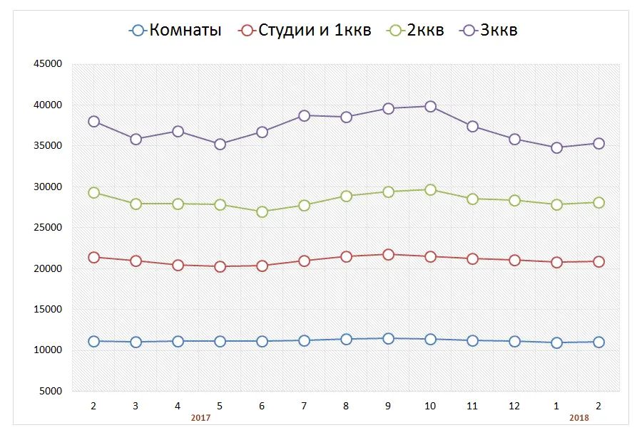 Самое дорогое жилье на рынке аренды по-прежнему предлагается в центральных районах города (Центральном, Петроградском, Василеостровском и Адмиралтейском). На конец февраля 2018 года средняя цена студии и однокомнатной квартиры в них – от 24,4 тыс. до 33,8 тыс. руб. в месяц, цена двухкомнатной – от 33,7 тыс. до 41,8 тыс. руб. Трехкомнатные в центральных районах предлагаются в среднем от 46,9 тыс. до 54,8 тыс. руб. в месяц, в зависимости от месторасположения и состояния.