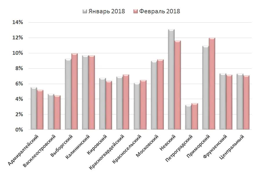 Наиболее популярным предложением на рынке аренды типового жилья на конец февраля 2018 года являются студии и однокомнатные квартиры в Приморском, Выборгском и Московском районах, средняя цена составляет 21,2 тыс. руб., 20,0 тыс. руб. и 23,0 тыс. руб. в месяц.