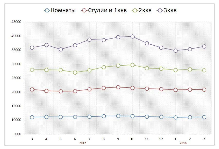 Самое дорогое жилье на рынке аренды по-прежнему предлагается в центральных районах города (Центральном, Петроградском, Василеостровском и Адмиралтейском). На конец марта 2018 года средняя цена студии и однокомнатной квартиры в них – от 24,3 тыс. до 33,7 тыс. руб. в месяц, цена двухкомнатной – от 33,7 тыс. до 40,4 тыс. руб. Трехкомнатные в центральных районах предлагаются в среднем от 45,0 тыс. до 55,0 тыс. руб. в месяц, в зависимости от месторасположения и состояния.