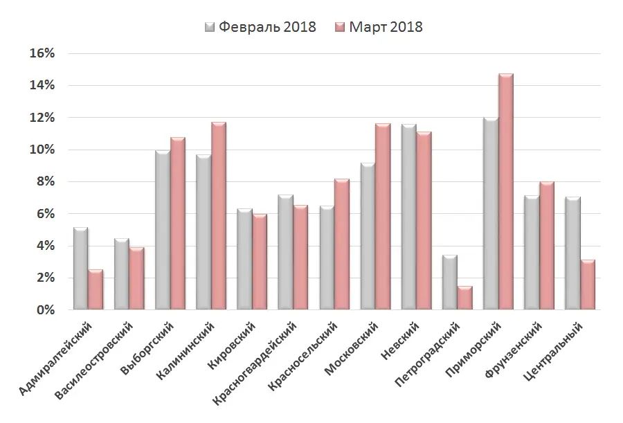 Наиболее популярным предложением на рынке аренды типового жилья на конец марта 2018 года являются студии и однокомнатные квартиры в Приморском, Калининском и Выборгском районах, средняя цена составляет 21,1 тыс. руб., 19,3 тыс. руб. и 19,8 тыс. руб. в месяц.