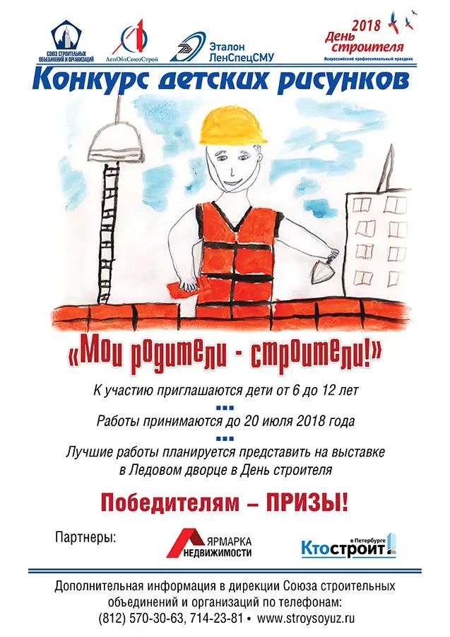 Конкурс рисунков «Мои родители – строители!» проводится накануне праздника «День строителя» по инициативе Союза строительных объединений и организаций в пятый раз. Соорганизаторами конкурса являются Группа «Эталон» и Союз строительных организаций Ленинградской области «ЛенОблСоюзСтрой». Конкур по традиции поддерживают газета «Кто строит в Петербурге» и Ярмарка недвижимости.