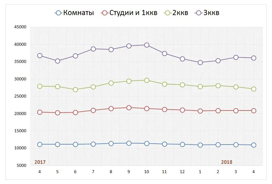 Самое дорогое жилье на рынке аренды предлагается в центральных районах города (Центральном, Петроградском, Василеостровском и Адмиралтейском). На конец апреля 2018 года средняя цена студии и однокомнатной квартиры в них – от 24,2 тыс. до 34,7 тыс. руб. в месяц, цена двухкомнатной – от 34,4 тыс. до 41,3 тыс. руб. Трехкомнатные в центральных районах предлагаются в среднем от 45,8 тыс. до 55,7 тыс. руб. в месяц, в зависимости от месторасположения и состояния.