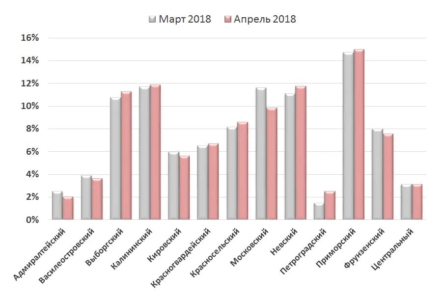 Наиболее популярным предложением на рынке аренды типового жилья на конец апреля 2018 года являются студии и однокомнатные квартиры в Приморском, Невском и Калининском районах, средняя цена составляет 20,8 тыс. руб., 18,9 тыс. руб. и 19,1 тыс. руб. в месяц.