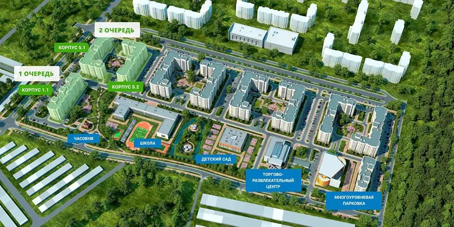На территории комплекса запланировано большое количество зеленых зон. Будет возведено несколько детских и спортивных площадок. Предполагается строительство велосипедных дорожек.