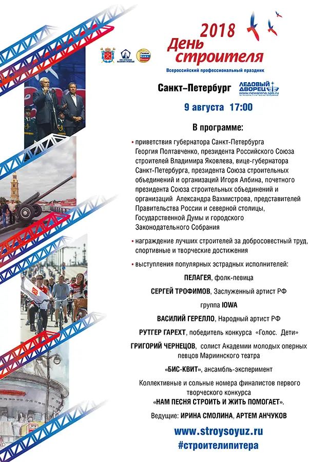Вместе с талантливыми строителями в Ледовом дворце выступят популярные эстрадные исполнители: Пелагея, Трофим, группа «Айова», Василий Герелло, Рутгер Гарехт (победитель конкурса «Голос. Дети»), ансамбль «БИС-КВИТ», Григорий Чернецов.