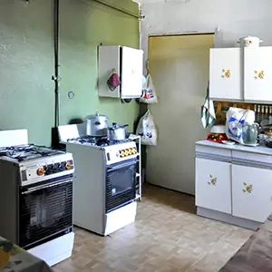 Поехал смотреть – оказалось, находчивый хозяин провел в комнату воду, поставил душевую кабину, оборудовал санузел, подключил электроплиту и смонтировал вытяжку.