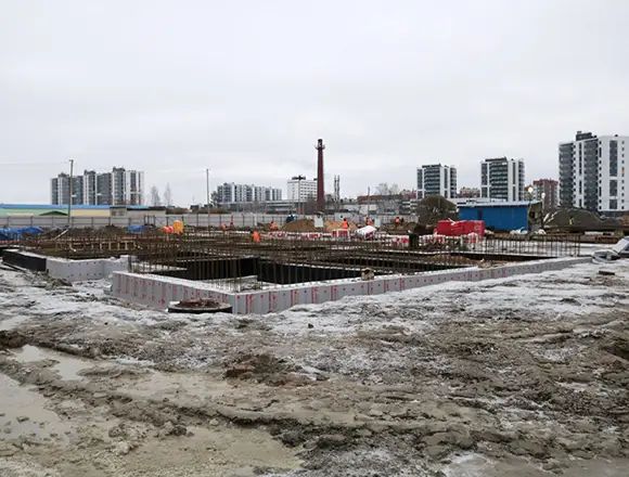 На текущий момент ведутся работы по устройству фундамента обоих корпусов. В частности, монтаж опалубки ростверков, армирование, гидроизоляция и обратная засыпка ростверков