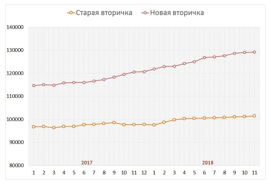 Динамика цен «старой» (до 2009 г.п.) и «новой» (после 2009 г.п.) вторички в 2017-2018 годах, руб. за кв. м