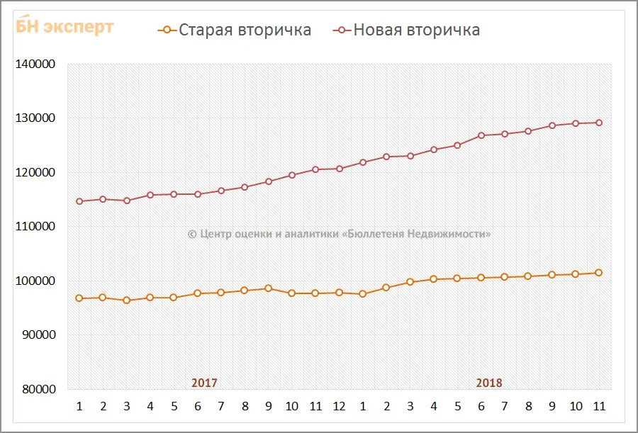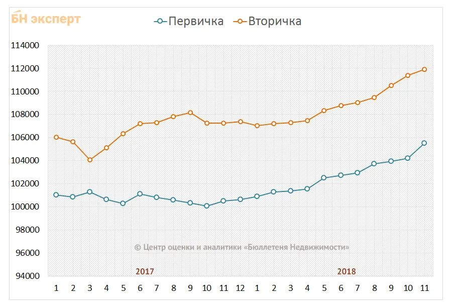 За 11 месяцев 2018 года изменение средней цены предложения на вторичном рынке квартир в рублевом эквиваленте составило 4,2%, это 4,5 тыс. руб. с кв. м. Основной рост цен отмечался в сентябре и октябре 2018 года.