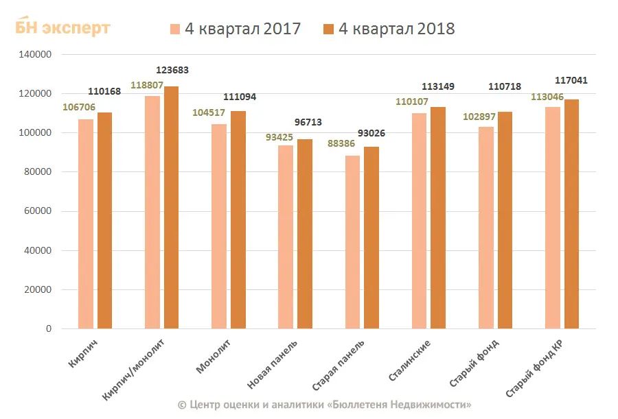 Самыми дорогими объектами в листингах являются кирпично-монолитные дома современной постройки, в IV квартале 2018 цена квадратного метра составляет 123,7 тыс. руб.