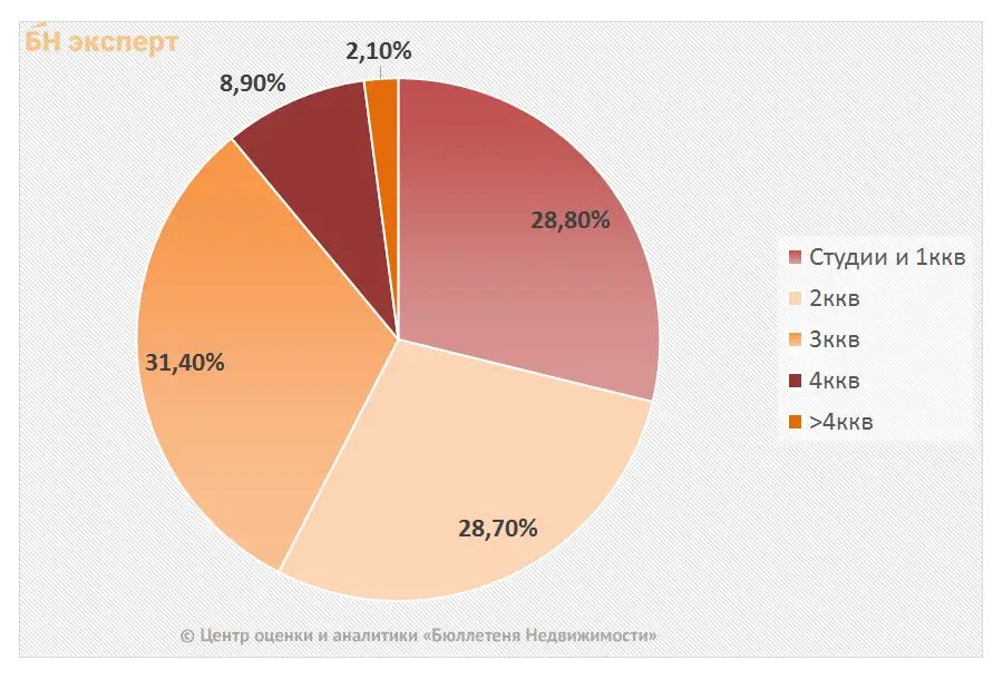 В структуре предложения по типу квартир на вторичном рынке квартир преобладают студии и одно- и двухкомнатные квартиры, они составили 57,6% рынка, трехкомнатные – 31,4%, многокомнатные – 11,0% от общего объема.