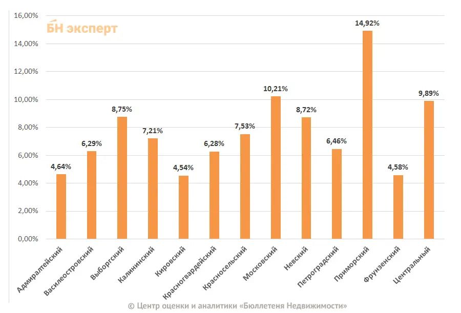 В структуре предложения по районам на конец месяца лидирующую позицию занимает Приморский район – 14,9% от объема выставленных на продажу квартир. Далее на вторичном рынке жилья большие доли занимают Выборгский, Московский, Невский и Центральный районы, предложение в них составляет 8,8%, 10,2%, 8,7% и 9,9% соответственно. Минимальную долю составляет предложение в Адмиралтейском, Кировском и Фрунзенском районах – 4,6%, 4,5% и 4,6% соответственно от общего объема выставленных на продажу квартир.