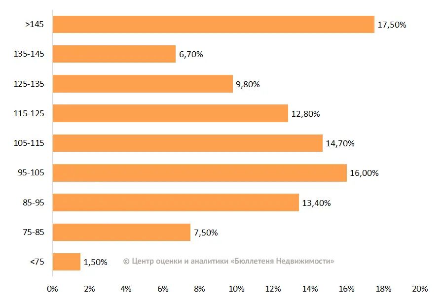 Большую долю рынка занимает диапазон цены от 85 тыс. до 125 тыс. руб. за кв. м и занимает 57%, стоимость дорогих квартир (более 145 тыс. руб. за кв. м) составляет 17,5%.