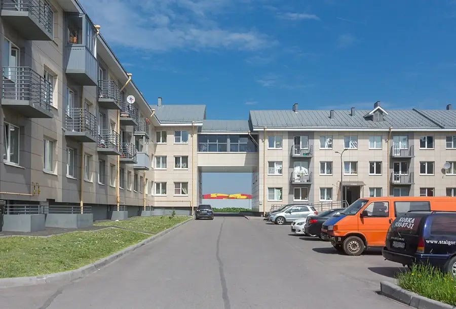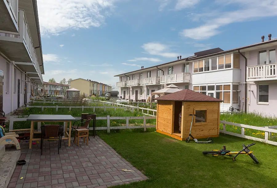 Здесь почти все как в городе: аккуратные дворы с детскими площадками, парковочные площадки по внешнему периметру. Но, в отличие от муравейников прикадья, всего три этажа.