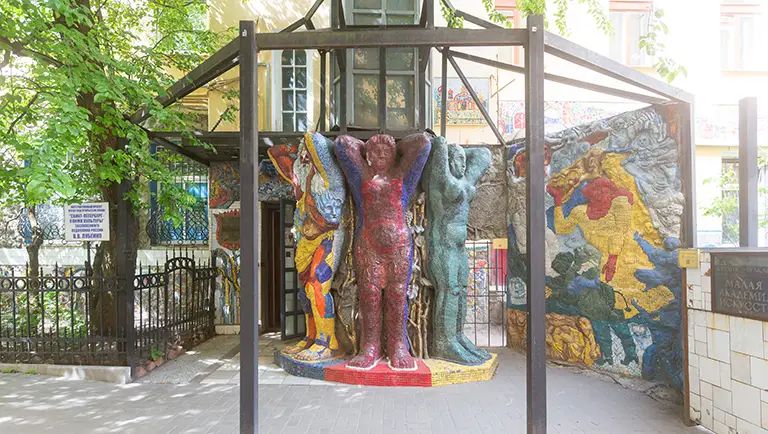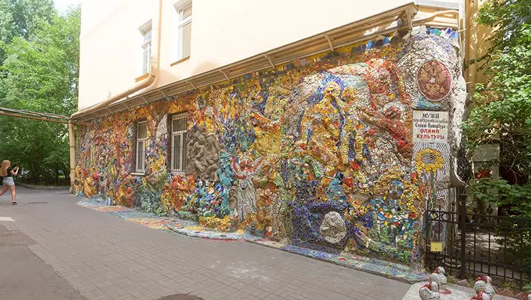 Музей под открытым небом «Санкт-Петербург – Олимп культуры», или просто Мозаичный дворик, как называют его местные жители, представляет собой выставку мозаичных работ заслуженного художника России Владимира Лубенко и его учеников из Малой Академии искусств. Барельефы, скульптуры, панно, фонтан и детский городок – все сверкает на солнце яркими кусочками смальты. Это волшебное место восхищает гостей и жителей города своей красотой и самобытностью.