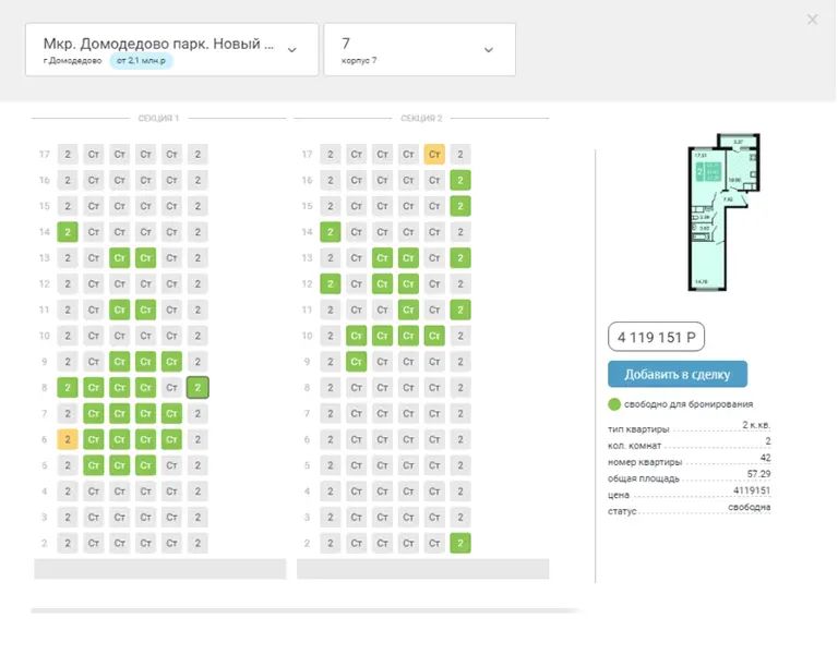 Разработали специальный виджет для бронирования квартир, облегчающий работу менеджеров. С его помощью менеджеры могут выбирать интересующую покупателя квартиру через визуальную карту дома, бронировать ее. Квартиры из этого виджета интегрированы с базой данных сайта, со всеми системами бронирования и содержат актуальную информацию по стоимости объектов, доступности к брони и покупке.