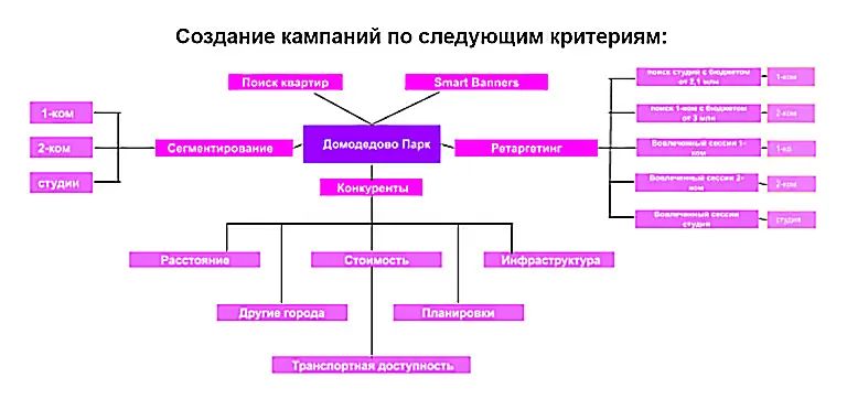 Далее настало время сегментации. Работали следующим образом. Для каждого типа выбирали ключи с определенным количеством комнат. Далее настроили ретаргетинг и показывали рекламу уже посетившим сайт пользователям, исходя из их интересов.