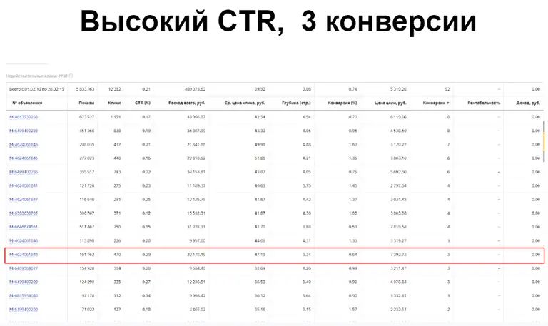 Не всегда высокая кликабельность объявления может обеспечить большое количество обращений. Не верите? У нас есть наглядный пример.