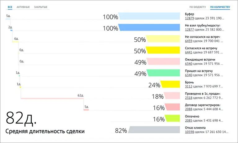 Менеджеры заводили сделки, только когда клиент был готов купить квартиру. Из-за этого воронка продаж в CRM не отражала реальную ситуацию, и, соответственно, невозможно было отследить, на каких этапах воронки возникают проблемы