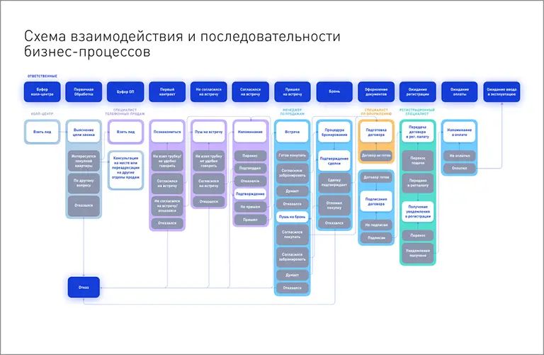 В результате мы составили технологическую карту бизнес-процессов, которая отражает реальную ситуацию в отделе продаж застройщика. Она показывает такие процессы, как работа с клиентом по воронке, бронирование квартиры, оформление сделки и т. д.