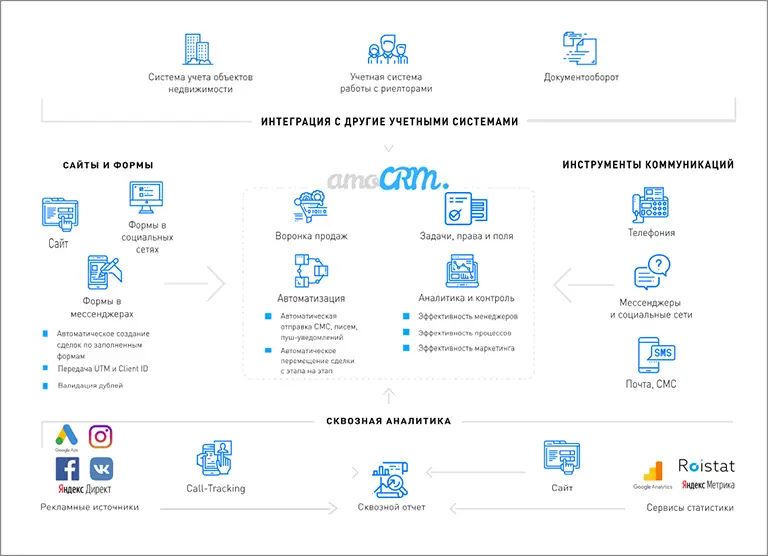Следующий шаг – интеграция CRM с текущей инфраструктурой: сайтом, телефонией и учетными системами застройщика (по работе с риэлторами, по работе с документооборотом, по учету объектов недвижимости).