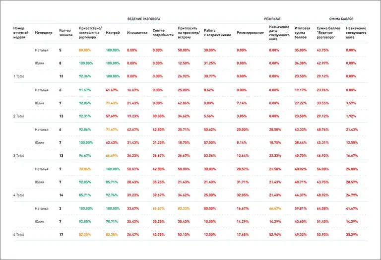 Если, предположим, у одного из сотрудников конверсия из лида во встречу ниже, чем у остальных, значит, у него возникли проблемы в работе. Чтобы найти причину, мы прослушиваем все его первые звонки клиентам и оцениваем их по заранее определенным критериям. Если по какому-то из критериев сотрудник проседает, значит, в нем и проблема.