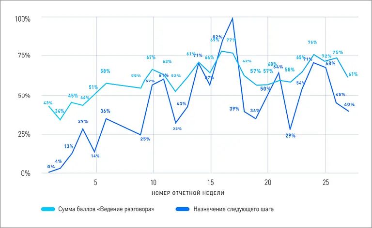 Динамика качества обработки звонков менеджера по продажам. Конверсия неразрывно связана с обучением сотрудника. Пока длилось обучение по теме «Ведение разговора», конверсия в «Назначение следующего шага» росла, а когда закончилось – упала